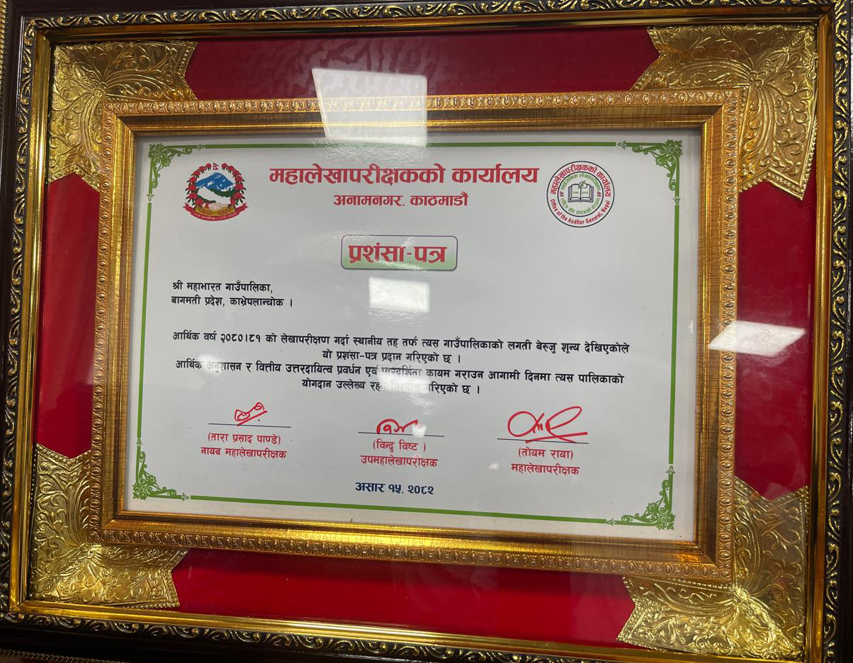 • काभ्रेपलाञ्चाेककाे शून्य बेरुजु महाभारत गाउँपालिकालाई सम्मान