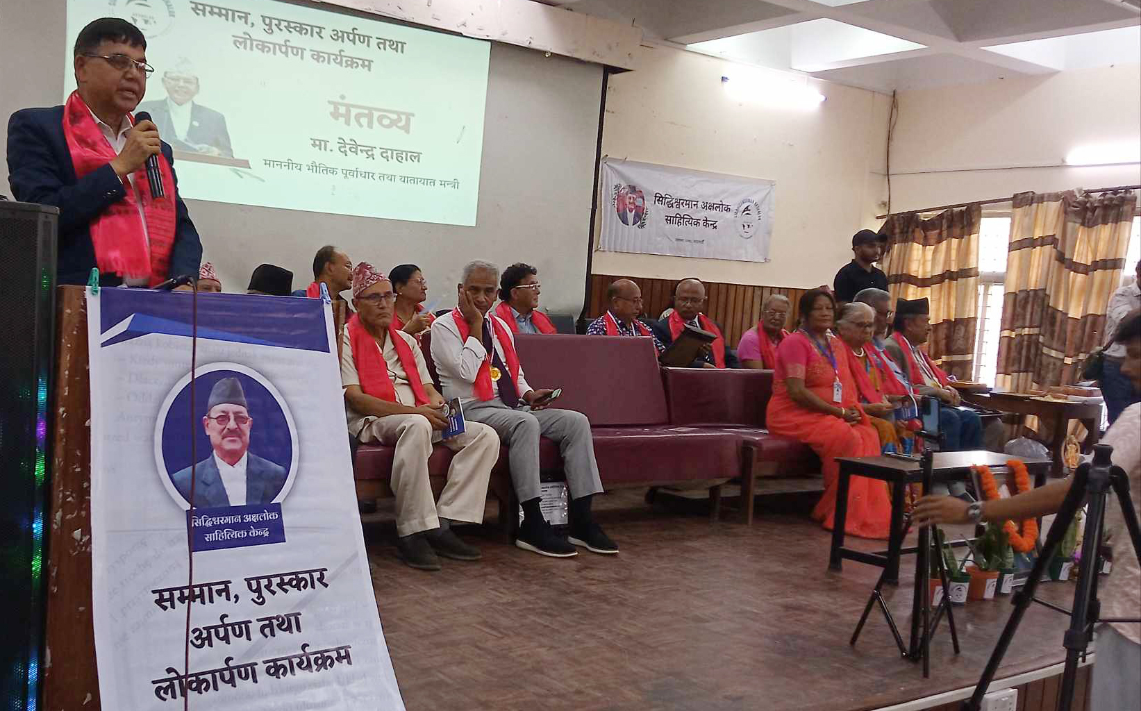 कार्यक्रममा भौतिक पूर्वाधार तथा यातायात मन्त्री देवेन्द्र दाहालले दिवंगत सिद्धिश्वरमान श्रेष्ठ प्रगतिवादी साहित्यका प्रखर व्यक्तित्व भएको बताउनुभयो । साहित्यकार सिद्धिश्वरमान श्रेष्ठले सामाजिक रुपान्तरणका लागि लेखनमार्फत् महत्वपूर्ण योगदान दिनुभएको मन्त्री दाहालको भनाइ छ ।