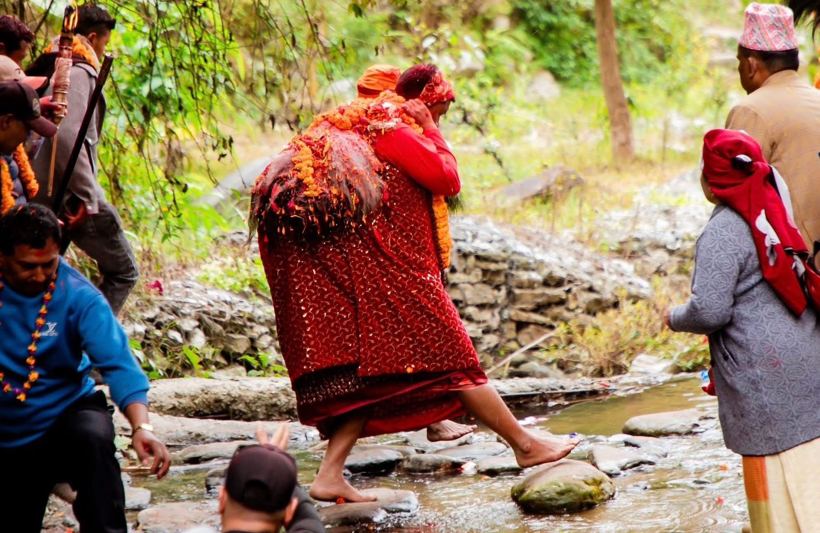 हातमा नाङगो खुडा, खुकुरी र तरबार बोकेका युवाहरु। अनि दियो, कलश, शंख, घण्ट सहितका नरनारी, प्रहरी र भक्तजनले बनाएको हाते साङ्लोको घेरा लगाएर माईको सवारी गराइन्छ । त्यही घेराभित्र लामो कपाल मात्र देखिने प्रतिमूर्ति पिठ्युँमा बोकेर पुजारीहरुले बेसीमा लैजादै गर्दा पन्चेबाजाको रौनकमा नाच्दै गरेका स्थानीय र जात्रामा सहभागिहरुले बाटोको दायाँवायाँ बसेर पुजापाठ र अविर जात्रा गर्ने गर्दछन । रानामगर थरका पुजारीले मात्र छुन मिल्ने त्यस मूर्ति कस्तो आकारको छ वा त्यस बाकसभित्र के छ भनेर आम सर्वसाधारणले अहिलेसम्म केही देख्न पाएका छैनन् ।