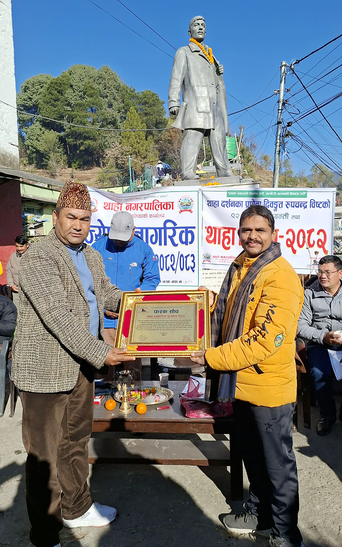 काठमाडौं । दार्शनिक राजनीतिज्ञ एवं थाहा आन्दोलनका प्रवर्तक रूपचन्द्र विष्टको स्मृतिमा स्थापित ‘थाहा पत्रकारिता पुरस्कार–२०८२’ बाट पत्रकार सुरेश बिडारी सम्मानित हुनुभएको छ । थाहा दिवस तथा रूपचन्द्र विष्टको जन्मजयन्तीका अवसरमा मकवानपुरको थाहा नगरपालिकामा आयोजित कार्यक्रममा खोज पत्रकारितामा सक्रिय पत्रकार बिडारीलाई पुरस्कार प्रदान गरिएको हो ।